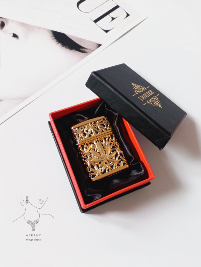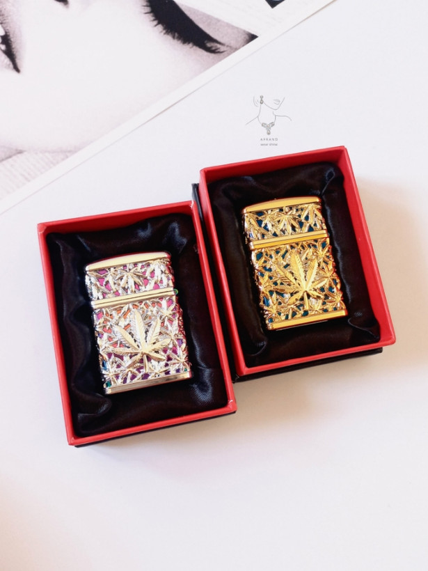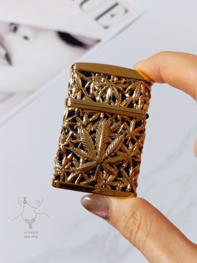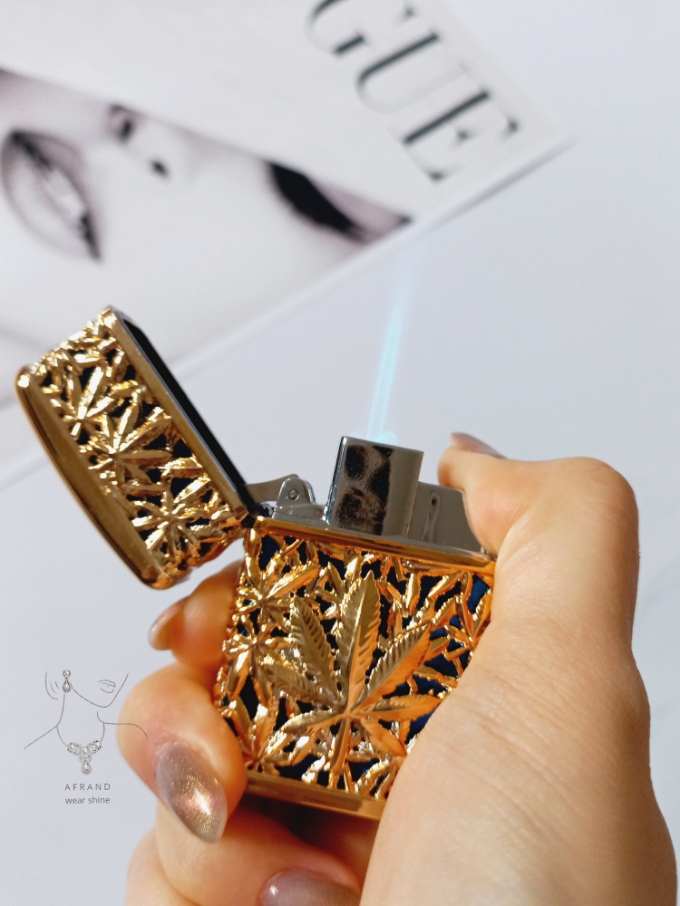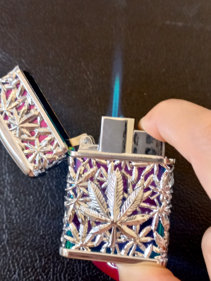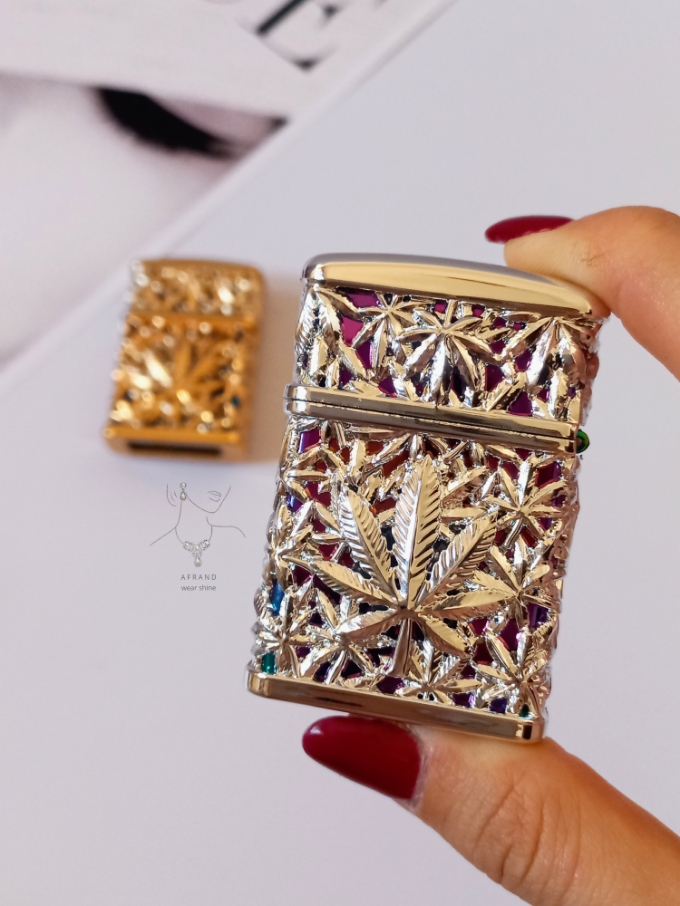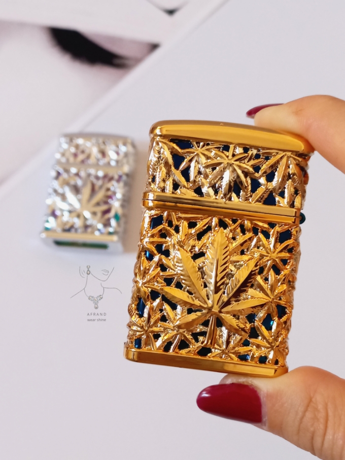 فندک ماریجوانا،رنگ طلایی آبی،نوع سوخت:گازی،همراه با جعبه،شعله اتمی