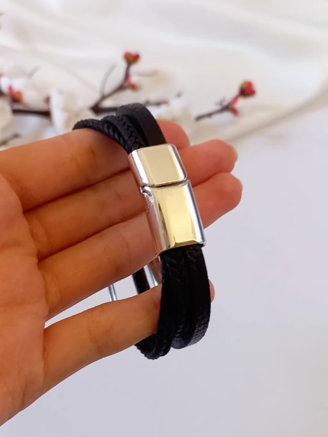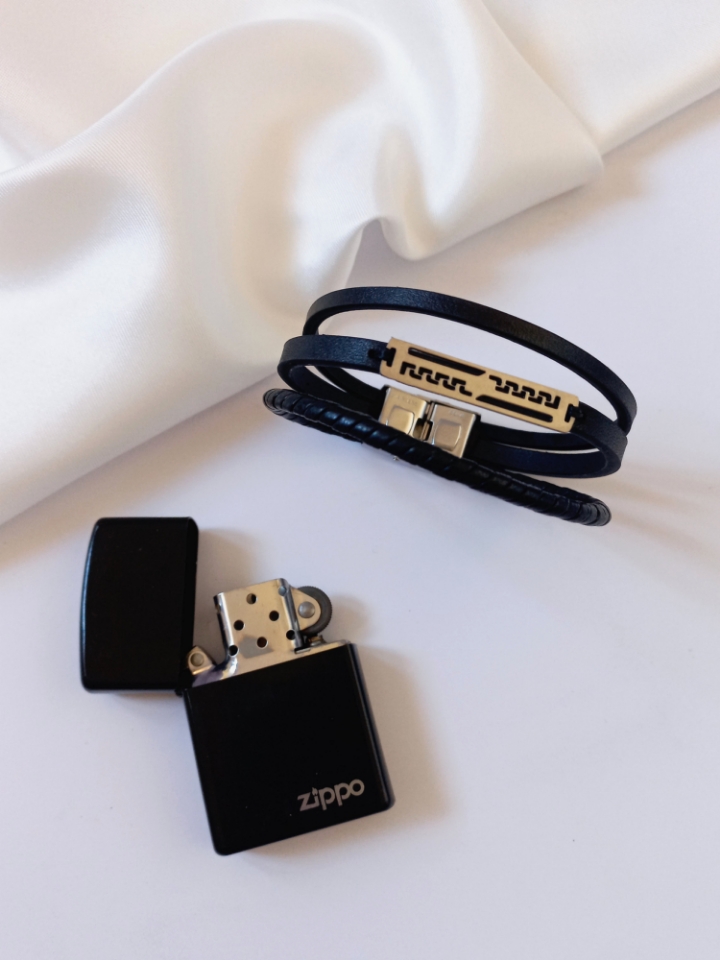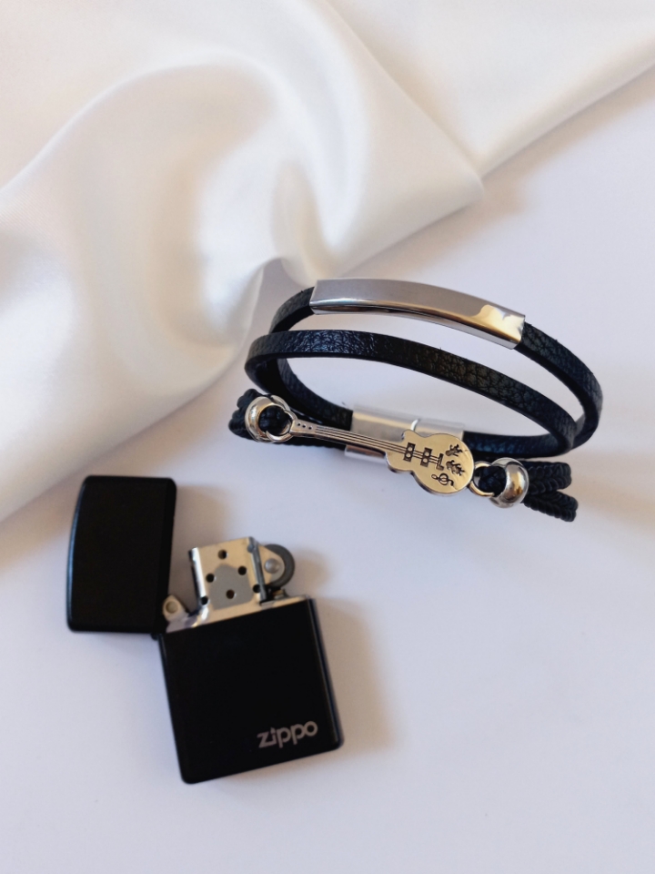 دستبند سه لاین،چنس چرم،جنس پلاک استیل،طول دستبند ۲۱ سانت